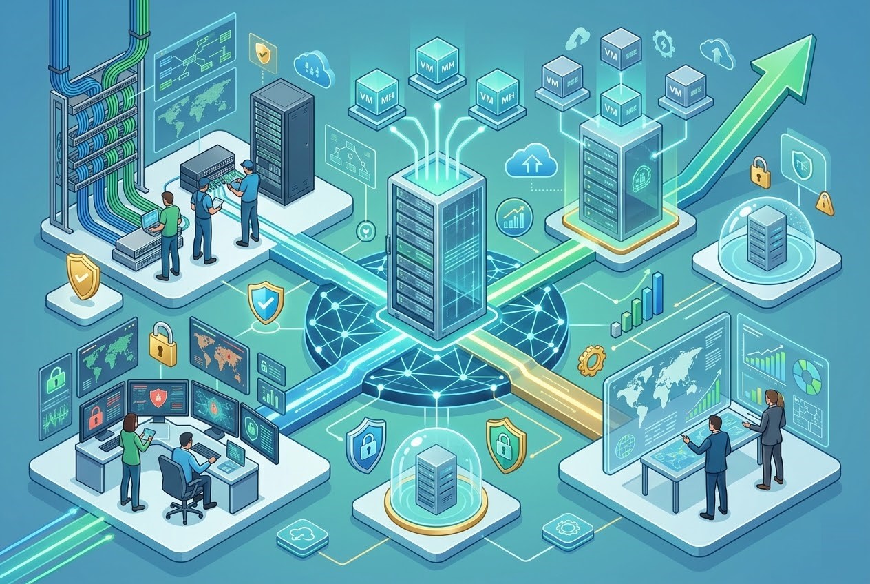 Network altyapı tasarımından siber güvenlik çözümlerine, sunucu ve sanallaştırma sistemlerinden yapısal kablolamaya kadar geniş bir hizmet yelpazesi sunarak işletmelerin tüm IT ihtiyaçlarını tek noktadan karşılamayı hedefliyoruz.